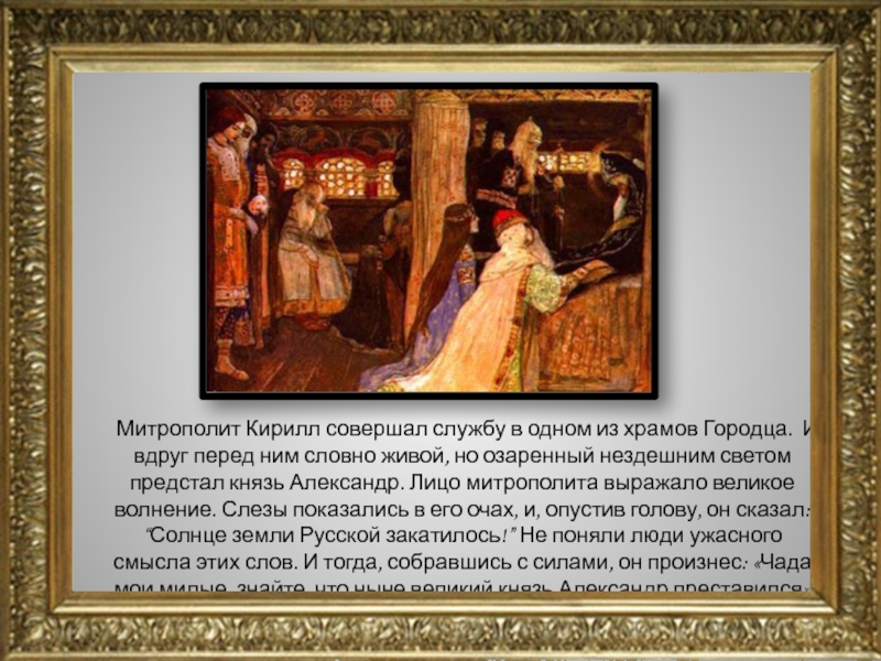 перед ним словно живой, но озаренный нездешним светом предстал князь Александр. Лицо митрополита выражало великое волнение. Слезы показались в его очах, и, опустив голову, он сказал: “Солнце земли Русской закатилось!” Не поняли люди ужасного смысла этих слов. И тогда, собравшись с силами, он произнес: «Чада мои милые, знайте, что ныне великий князь Александр преставился».