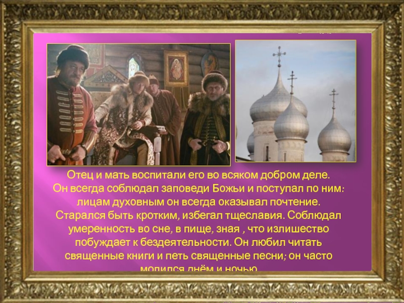 заповеди Божьи и поступал по ним: лицам духовным он всегда оказывал почтение. Старался быть кротким, избегал тщеславия. Соблюдал умеренность во сне, в пище, зная , что излишество побуждает к бездеятельности. Он любил читать священные книги и петь священные песни; он часто молился днём и ночью