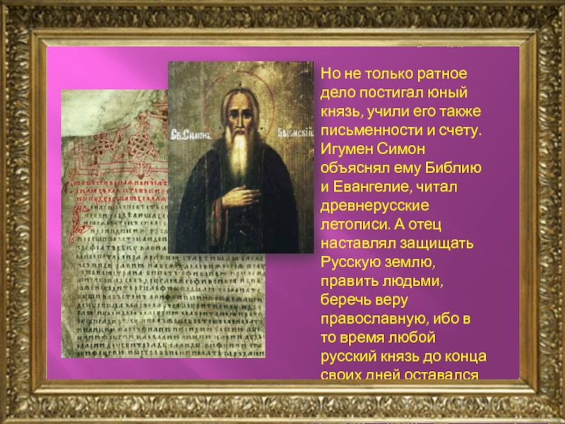 письменности и счету. Игумен Симон объяснял ему Библию и Евангелие, читал древнерусские летописи. А отец наставлял защищать Русскую землю, править людьми, беречь веру православную, ибо в то время любой русский князь до конца своих дней оставался правителем и воином