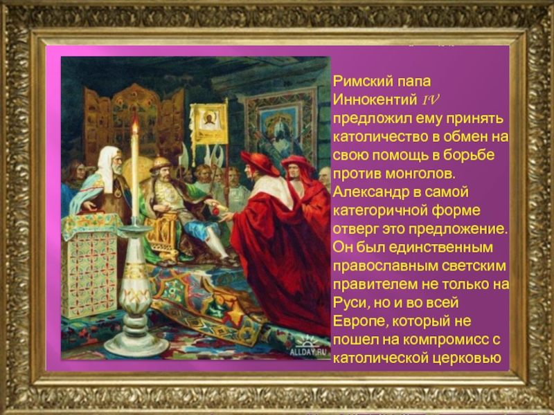 Слайд 14Римский папа Иннокентий IV предложил ему принять католичество в обмен на