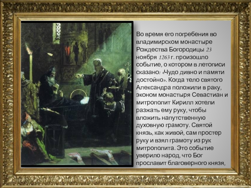 1263 г. произошло событие, о котором в летописи сказано: «Чудо дивно и памяти достойно». Когда тело святого Александра положили в раку, эконом монастыря Севастиан и митрополит Кирилл хотели разжать ему руку, чтобы вложить напутственную духовную грамоту. Святой князь, как живой, сам простер руку и взял грамоту из рук митрополита. Это событие уверило народ, что Бог прославит благоверного князя, и положило начало его посмертному почитанию