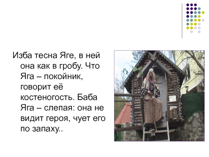 Слайд 5Изба тесна Яге, в ней она как в гробу. Что Яга