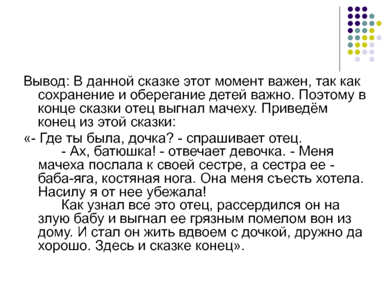 Слайд 9Вывод: В данной сказке этот момент важен, так как сохранение и