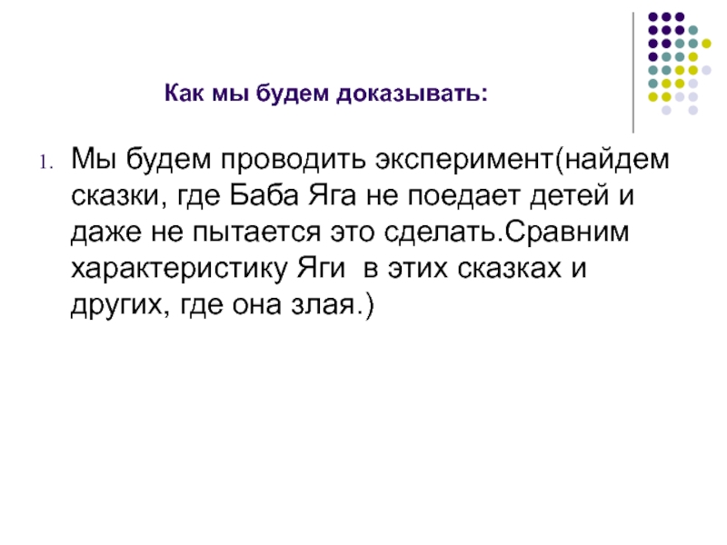 проводить эксперимент(найдем сказки, где Баба Яга не поедает детей и даже не пытается это сделать.Сравним характеристику Яги в этих сказках и других, где она злая.)