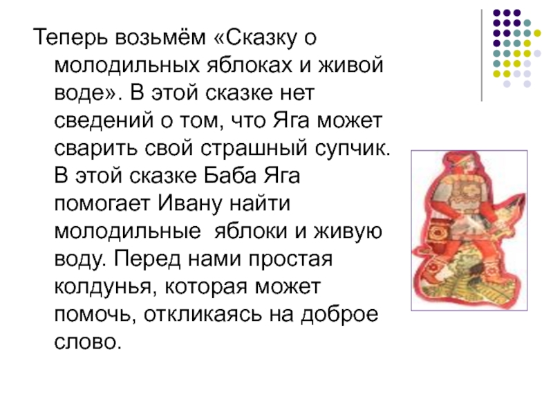 сказке нет сведений о том, что Яга может сварить свой страшный супчик. В этой сказке Баба Яга помогает Ивану найти молодильные яблоки и живую воду. Перед нами простая колдунья, которая может помочь, откликаясь на доброе слово.