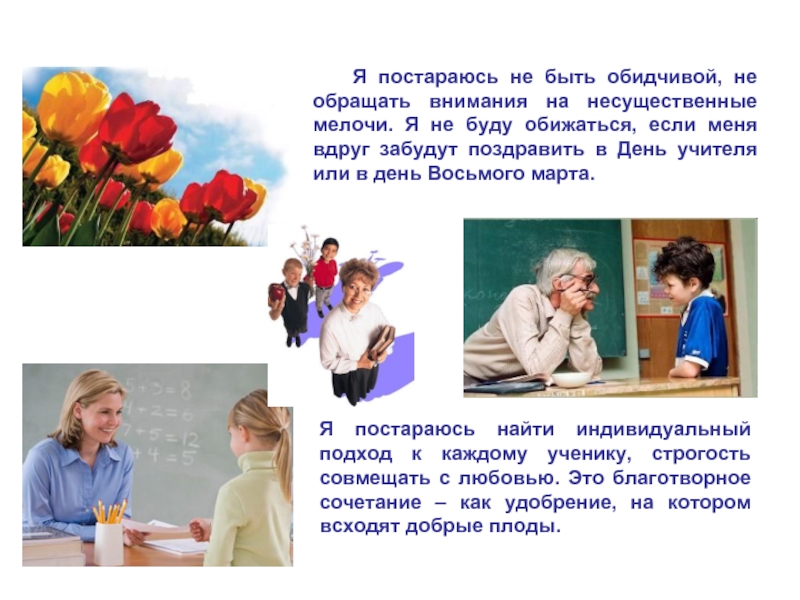 Я постараюсь найти индивидуальный подход к каждому ученику, строгость совмещать с любовью. Это благотворное сочетание – как удобрение, на котором всходят добрые плоды.