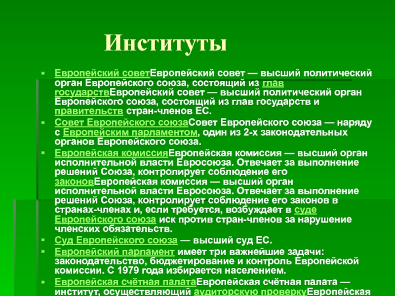 Европейская комиссияЕвропейская комиссия — высший орган исполнительной власти Евросоюза. Отвечает за выполнение решений Союза, контролирует соблюдение его законовЕвропейская комиссия — высший орган исполнительной власти Евросоюза. Отвечает за выполнение решений Союза, контролирует соблюдение его законов в странах-членах и, если требуется, возбуждает в суде Европейского союза иск против стран-членов за нарушение членских обязательств.