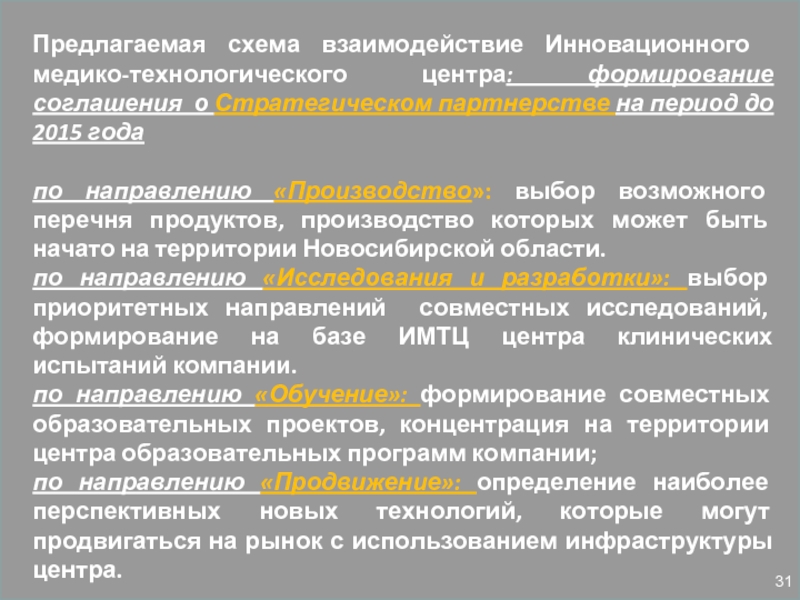 Создание такого центра позволит максимально снизить инвестиционные затраты на разработку отдельных инновационных проектов, повысить их привлекательность для инвесторов различного уровня, встроить их в медицинские технологии.