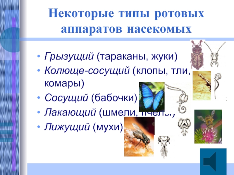 Слайд 8Некоторые типы ротовых аппаратов насекомых