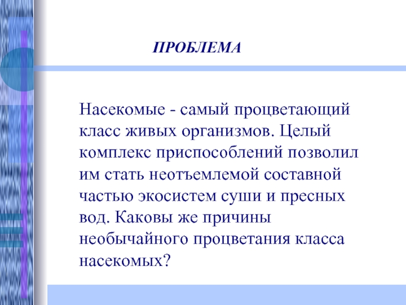 им стать неотъемлемой составной частью экосистем суши и пресных вод. Каковы же причины необычайного процветания класса насекомых?