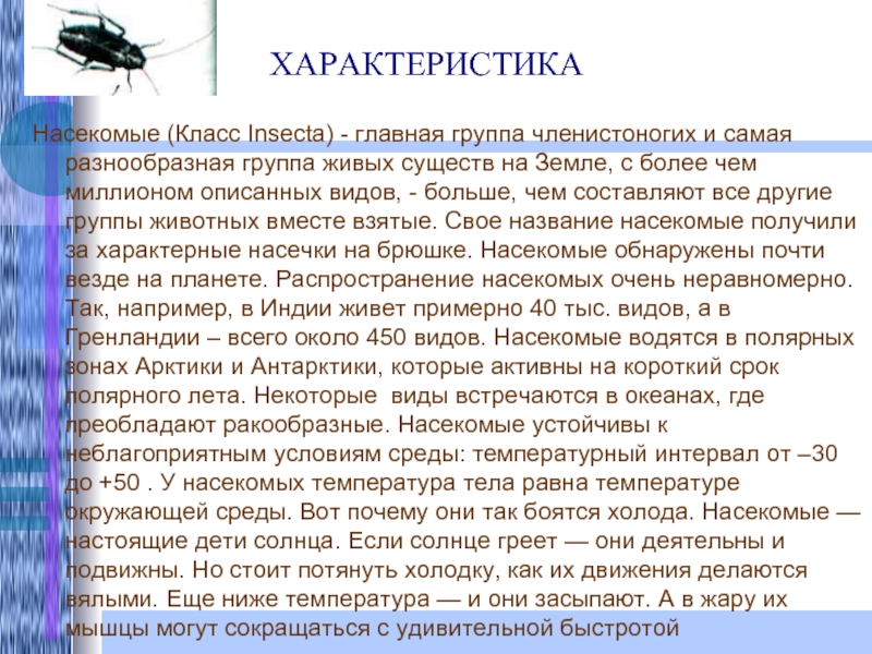 живых существ на Земле, с более чем миллионом описанных видов, - больше, чем составляют все другие группы животных вместе взятые. Свое название насекомые получили за характерные насечки на брюшке. Насекомые обнаружены почти везде на планете. Распространение насекомых очень неравномерно. Так, например, в Индии живет примерно 40 тыс. видов, а в Гренландии – всего около 450 видов. Насекомые водятся в полярных зонах Арктики и Антарктики, которые активны на короткий срок полярного лета. Некоторые виды встречаются в океанах, где преобладают ракообразные. Насекомые устойчивы к неблагоприятным условиям среды: температурный интервал от –30 до +50 . У насекомых температура тела равна температуре окружающей среды. Вот почему они так боятся холода. Насекомые — настоящие дети солнца. Если солнце греет — они деятельны и подвижны. Но стоит потянуть холодку, как их движения делаются вялыми. Еще ниже температура — и они засыпают. А в жару их мышцы могут сокращаться с удивительной быстротой