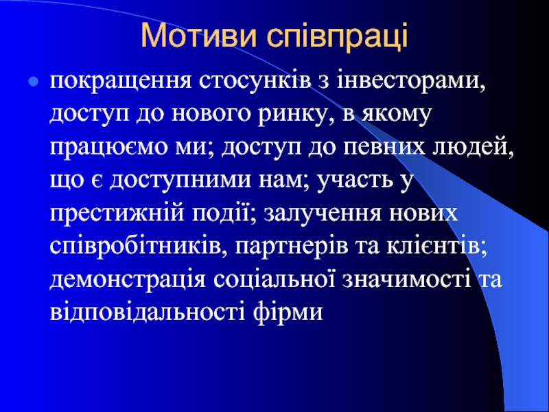 покращення стосунків з інвесторами, доступ до нового ринку, в якому