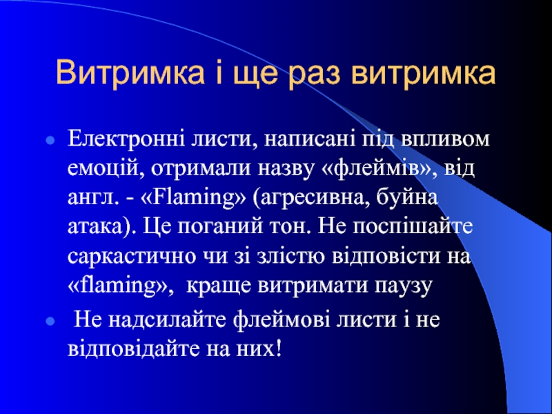 назву «флеймів», від англ. - «Flaming» (агресивна, буйна атака). Це поганий тон. Не поспішайте саркастично чи зі злістю відповісти на «flaming», краще витримати паузу