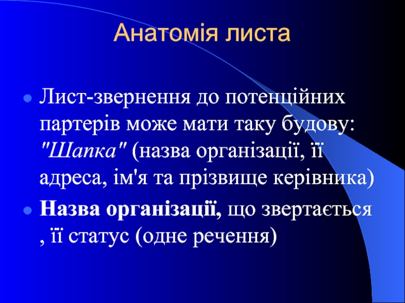 Лист-звернення до потенційних партерів може мати таку будову: "Шапка" (назва