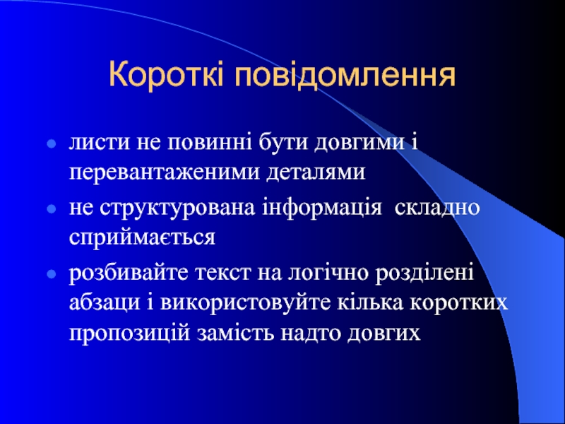 розбивайте текст на логічно розділені абзаци і використовуйте кілька коротких пропозицій замість надто довгих
