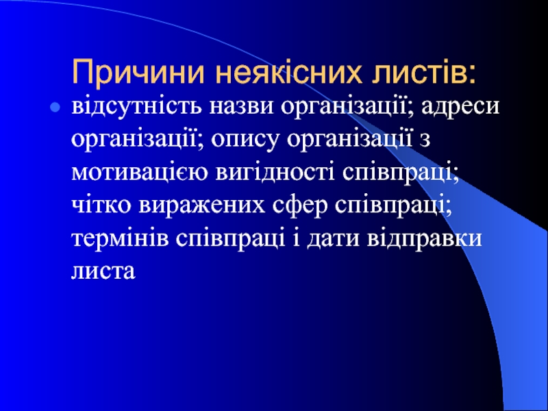 Слайд 8відсутність назви організації; адреси організації; опису організації з мотивацією вигідності співпраці;