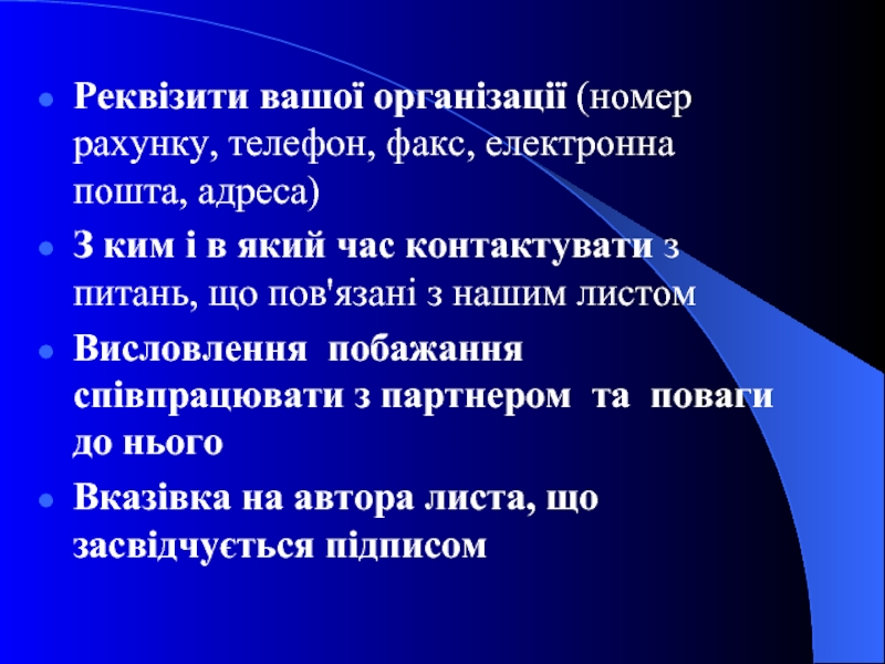 Реквізити вашої організації (номер рахунку, телефон, факс, електронна пошта, адреса)