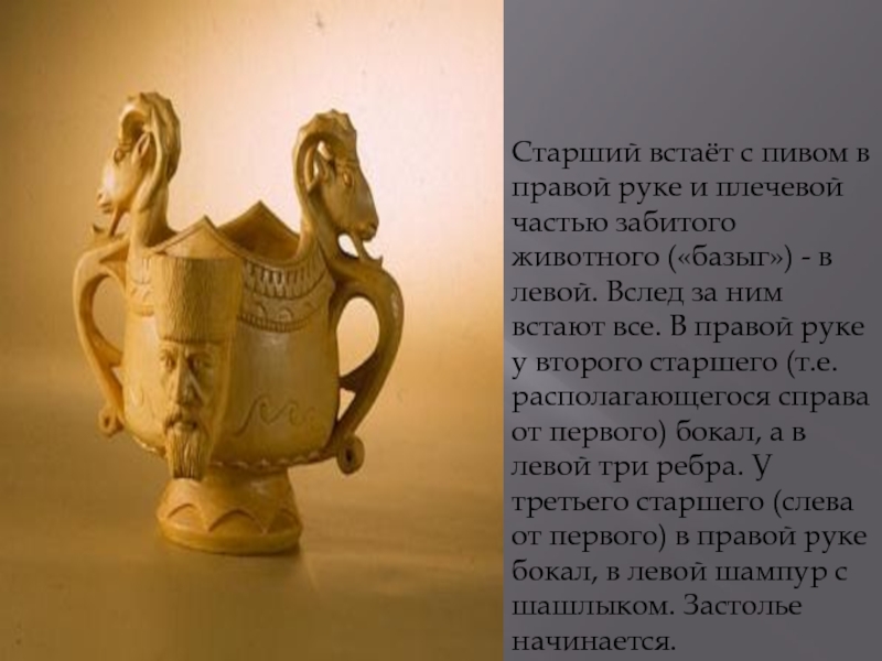животного («базыг») - в левой. Вслед за ним встают все. В правой руке у второго старшего (т.е. располагающегося справа от первого) бокал, а в левой три ребра. У третьего старшего (слева от первого) в правой руке бокал, в левой шампур с шашлыком. Застолье начинается.
