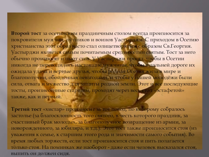 и воинов Уастырджи. С приходом в Осетию христианства этот образ часто стал олицетворяться с образом Св.Георгия. Уастырджи является самым почитаемым среди осетин святым. Тост за него обычно произносят и пьют стоя. У Уастырджи просят, чтобы в Осетии никогда не переводились настоящие мужчины, чтобы в дальней дороге их ожидала удача и верные друзья, чтобы родная Осетия жила в мире и благополучии, обойдённая невзгодами, и чтобы у нашей молодёжи были сила, отвага и мужество для защиты родной земли. Этот и все последующие тосты, произнесённые старшим, проходят через весь стол «эстафетой» также, как и первый.