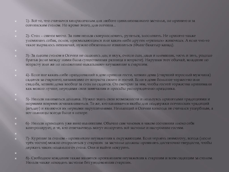 8)- Свободное хождение также является проявлением неуважения к старшим и всем сидящим за столом. Нельзя также покидать застолье без уведомления старших.