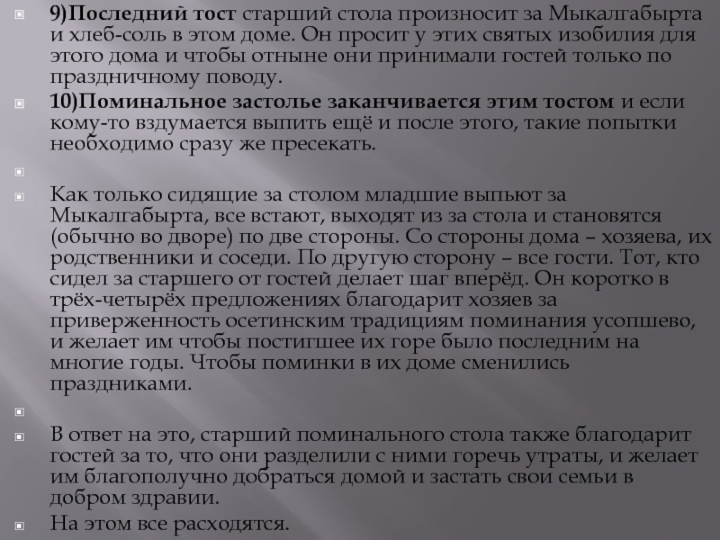 9)Последний тост старший стола произносит за Мыкалгабырта и хлеб-соль в этом доме.