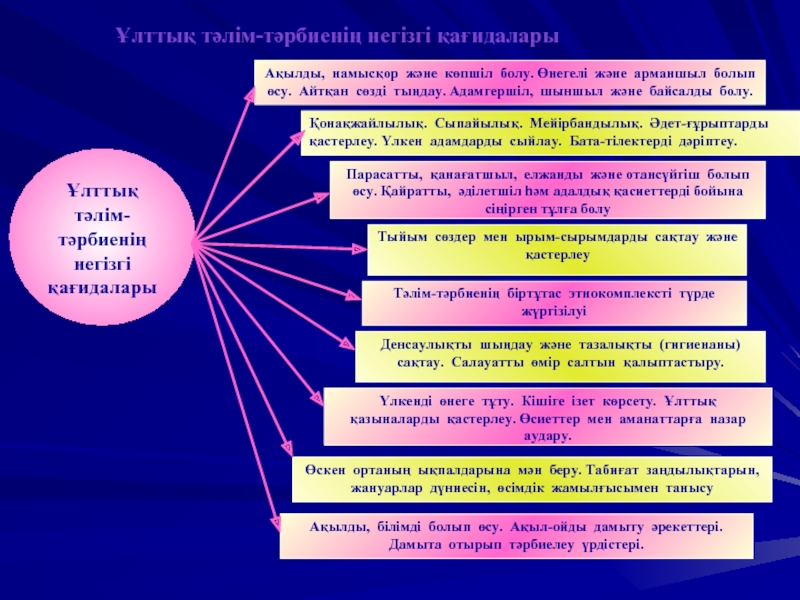 Үлкенді өнеге тұту. Кішіге ізет көрсету. Ұлттық қазыналарды қастерлеу. Өсиеттер мен аманаттарға назар аудару.
