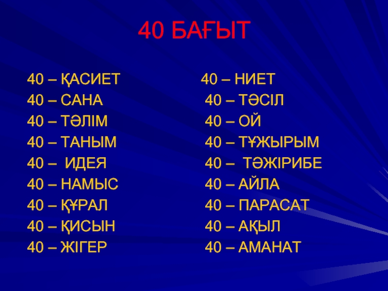 Ақылды, намысқор және көпшіл болу. Өнегелі және арманшыл болып өсу. Айтқан сөзді тыңдау. Адамгершіл, шыншыл және байсалды болу.