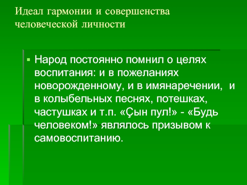 и в пожеланиях новорожденному, и в имянаречении, и в колыбельных песнях, потешках, частушках и т.п. «Çын пул!» - «Будь человеком!» являлось призывом к самовоспитанию.