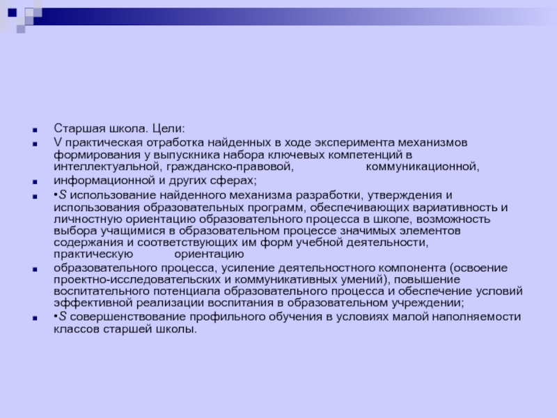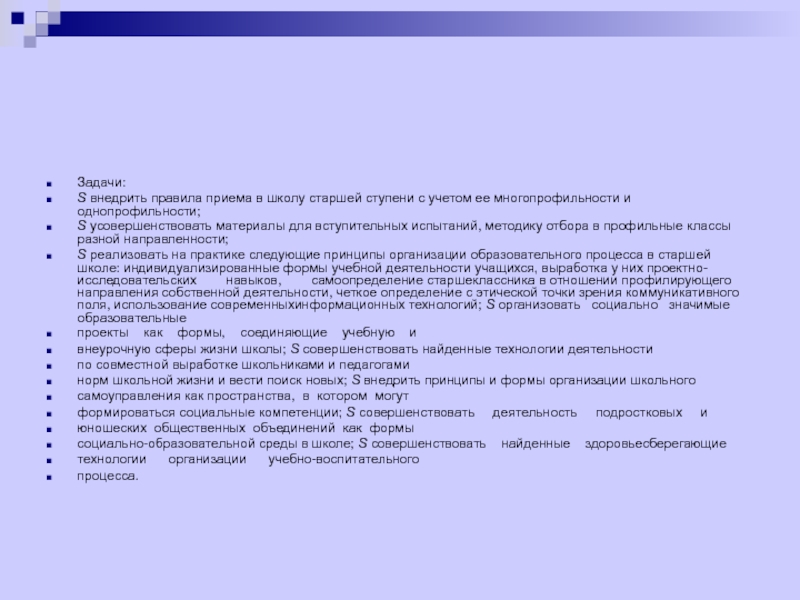 S реализовать на практике следующие принципы организации образовательного процесса в старшей школе: индивидуализированные формы учебной деятельности учащихся, выработка у них проектно-исследовательских навыков, самоопределение старшеклассника в отношении профилирующего направления собственной деятельности, четкое определение с этической точки зрения коммуникативного поля, использование современныхинформационных технологий; S организовать социально значимые образовательные