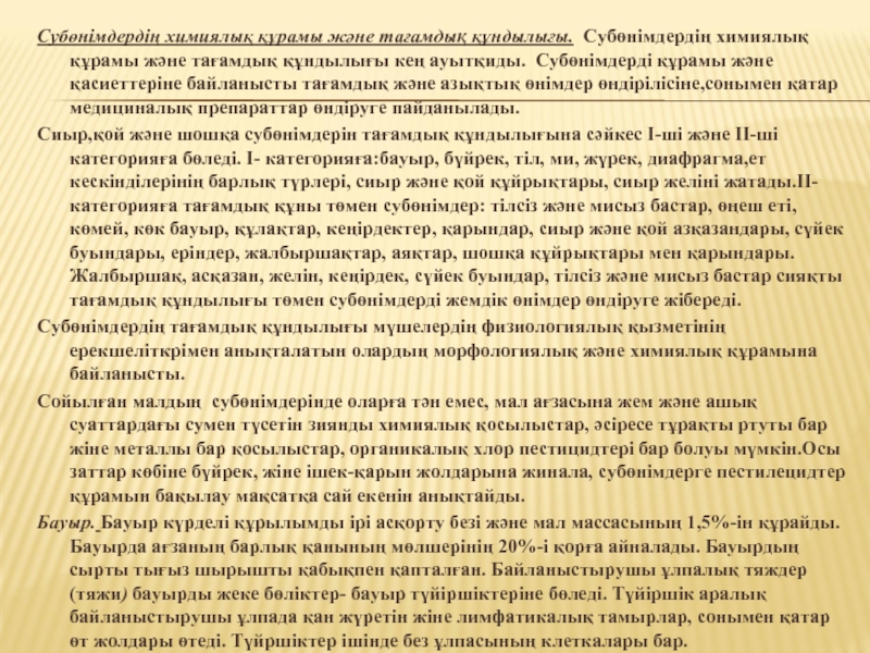 Слайд 11 Субөнімдердің қолданылуы. Өңделген субөнімдерді морфологиялық, химиялық құрамына және тағамдық құндылығына