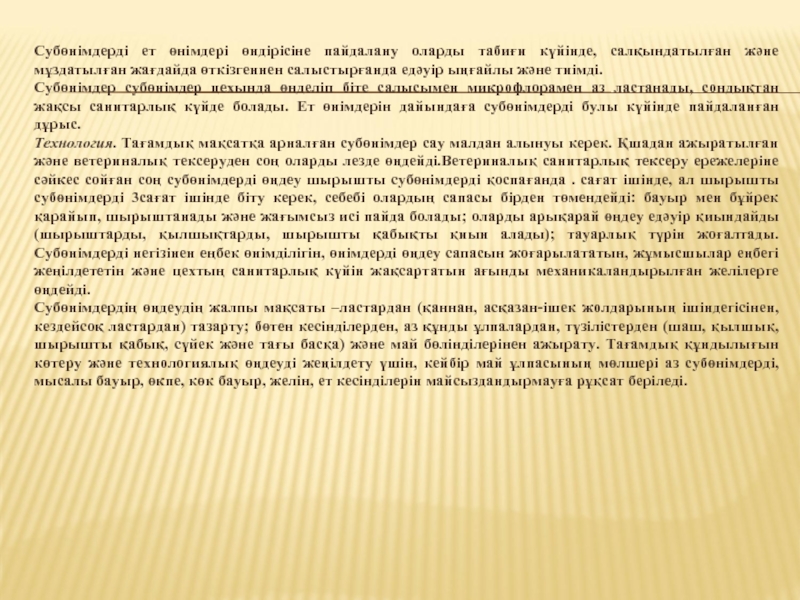 Слайд 12Субөнімдерді ет өнімдері өндірісіне пайдалану оларды табиғи күйінде, салқындатылған және мұздатылған