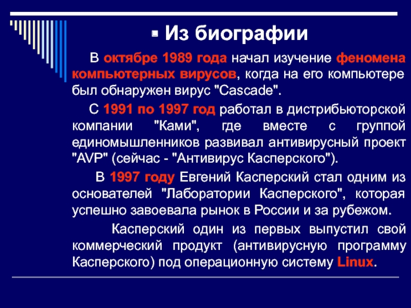 Касперский один из первых выпустил свой коммерческий продукт (антивирусную программу Касперского) под операционную систему Linux.