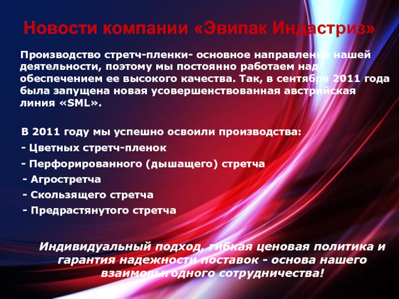 Индивидуальный подход, гибкая ценовая политика и гарантия надежности поставок - основа нашего взаимовыгодного сотрудничества!