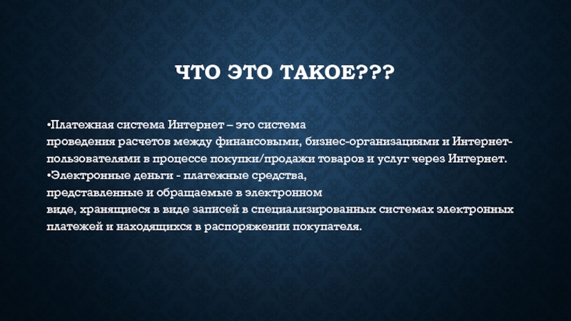 •Платежная система Интернет – это система проведения расчетов между финансовыми, бизнес-организациями и Интернет-пользователями в процессе покупки/продажи товаров и услуг через Интернет.