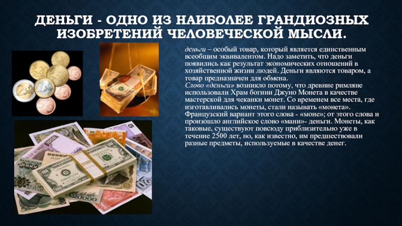 Слайд 2ДЕНЬГИ - ОДНО ИЗ НАИБОЛЕЕ ГРАНДИОЗНЫХ ИЗОБРЕТЕНИЙ ЧЕЛОВЕЧЕСКОЙ МЫСЛИ.
