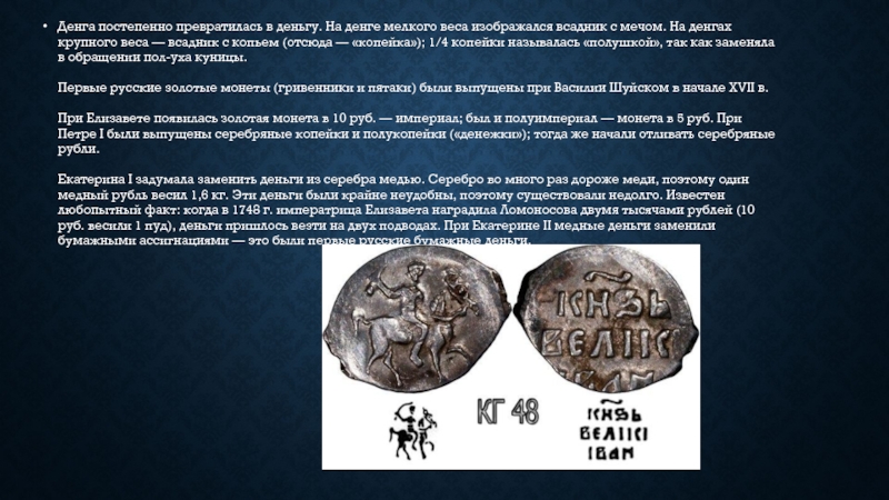 Слайд 9Денга постепенно превратилась в деньгу. На денге мелкого веса изображался всадник