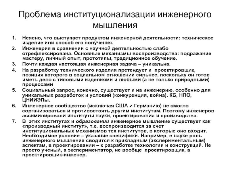 В этих институтах и образовании инженерное мышление существует как «производный институт», т.е. воспроизводится за счет институциональных механизмов тех институтов, в которые оно входит. Необходимое условие – указание специфики. Например, в науке роль инженерного мышления сводится к прикладным (экспериментальным) аспектам, в проектировании – к разработке технологии и конструкций. Не просто ученый, а экспериментатор, не вообще проектировщик, а проектировщик-инженер.