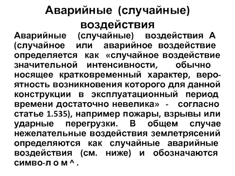 как «случайное воздействие значительной интенсивности, обычно носящее кратковременный характер, вероятность возникновения которого для данной конструкции в эксплуатационный период времени достаточно невелика» - согласно статье 1.535), например пожары, взрывы или ударные перегрузки. В общем случае нежелательные воздействия землетрясений определяются как случайные аварийные воздействия (см. ниже) и обозначаются символ о м ^ .