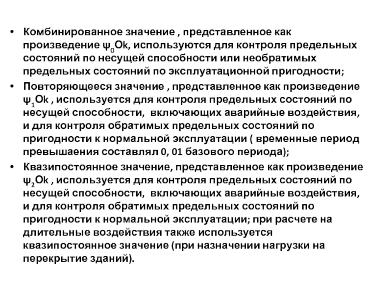 Повторяющееся значение , представленное как произведение ψ1Οk , используется для контроля предельных состояний по несущей способности, включающих аварийные воздействия, и для контроля обратимых предельных состояний по пригодности к нормальной эксплуатации ( временные период превышаения составлял 0, 01 базового периода);