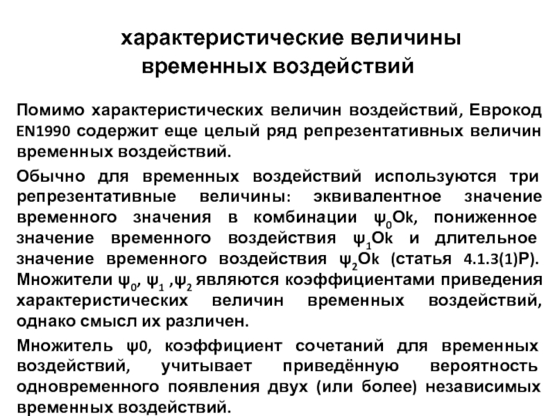 Обычно для временных воздействий используются три репрезентативные величины: эквивалентное значение временного значения в комбинации ψ0Οk, пониженное значение временного воздействия ψ1Οk и длительное значение временного воздействия ψ2Οk (статья 4.1.3(1)Р). Множители ψ0, ψ1 ,ψ2 являются коэффициентами приведения характеристических величин временных воздействий, однако смысл их различен.