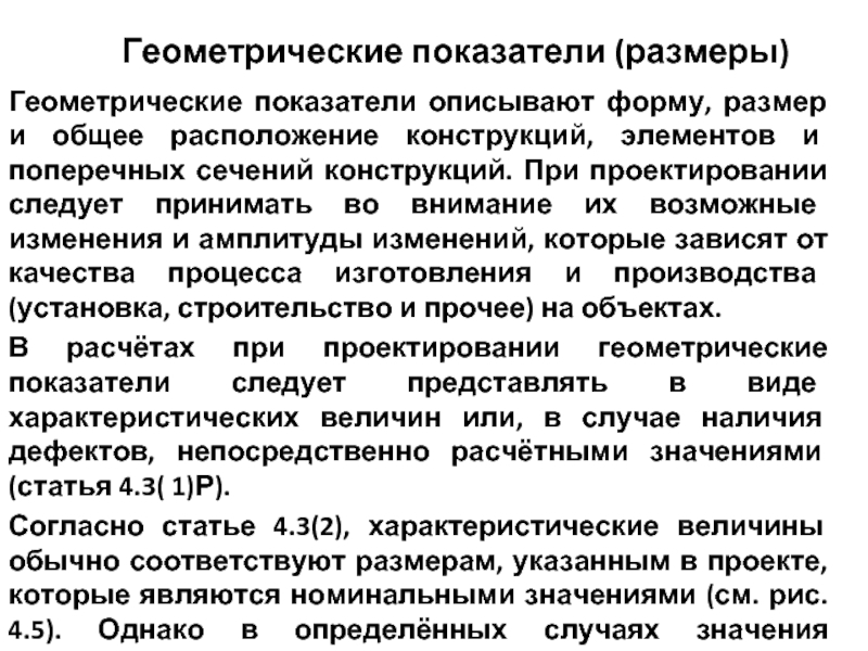 В расчётах при проектировании геометрические показатели следует представлять в виде характеристических величин или, в случае наличия дефектов, непосредственно расчётными значениями (статья 4.3( 1)Р).