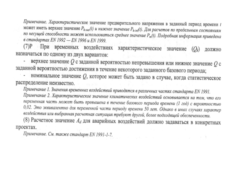 при проектировании как различные характерные (репрезентативные) величины. Наиболее важным репрезентативным значением воздействия F (статья 4.1.2(1)Р) является характеристическая величина Fk. В зависимости от представленных данных и принятой практики характеристическая величина должна быть определена соответствующим EN стандартом как средняя, нижняя или верхняя величина или как номинальное значение (которое не относится ни к одному из статистических распределений).