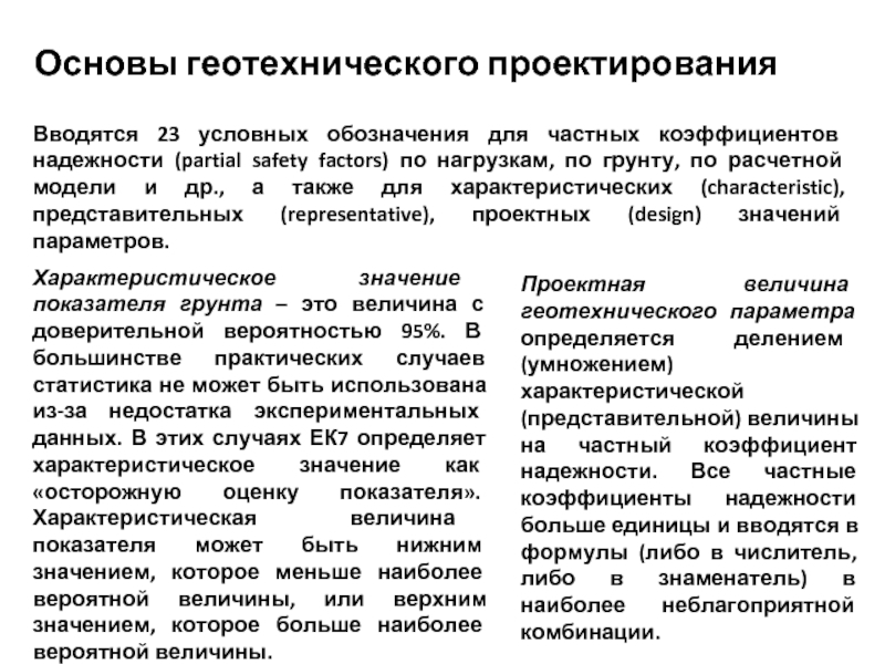 safety factors) по нагрузкам, по грунту, по расчетной модели и др., а также для характеристических (charаcteristic), представительных (representative), проектных (design) значений параметров.
