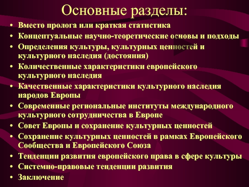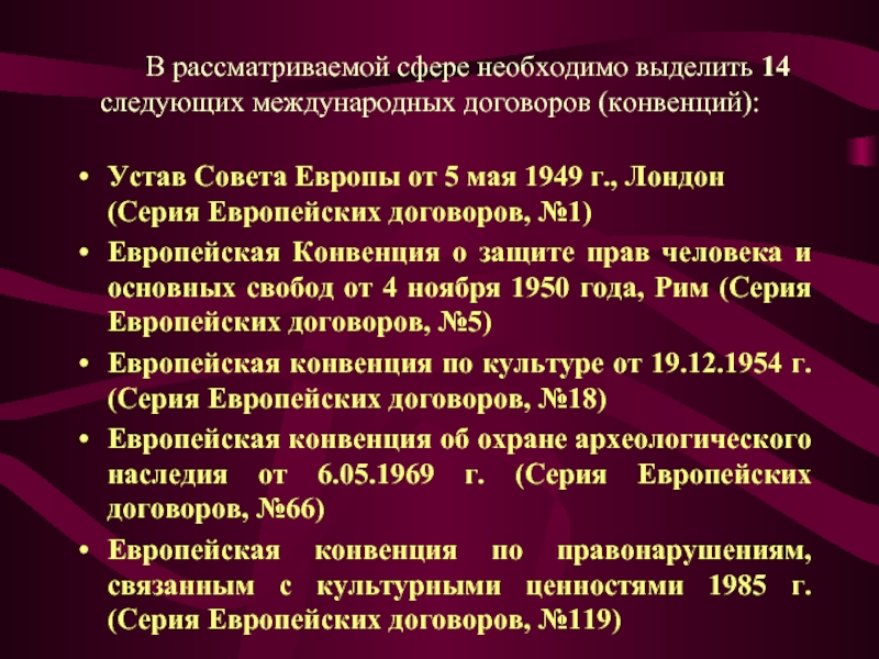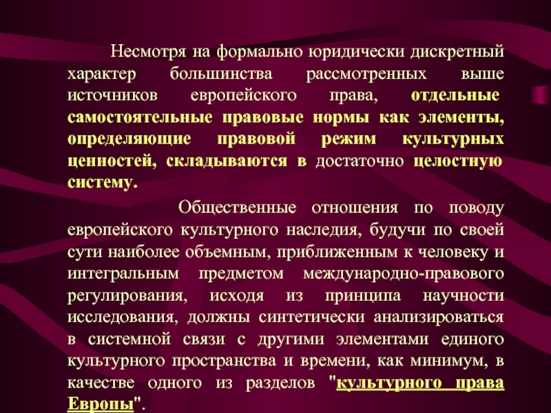 Общественные отношения по поводу европейского культурного наследия, будучи по своей сути наиболее объемным, приближенным к человеку и интегральным предметом международно-правового регулирования, исходя из принципа научности исследования, должны синтетически анализироваться в системной связи с другими элементами единого культурного пространства и времени, как минимум, в качестве одного из разделов "культурного права Европы".