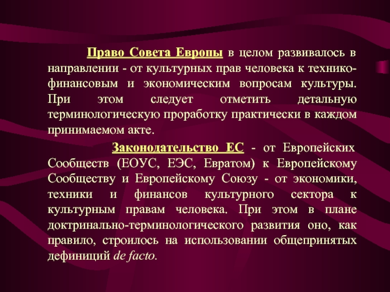Законодательство ЕС - от Европейских Сообществ (ЕОУС, ЕЭС, Евратом) к Европейскому Сообществу и Европейскому Союзу - от экономики, техники и финансов культурного сектора к культурным правам человека. При этом в плане доктринально-терминологического развития оно, как правило, строилось на использовании общепринятых дефиниций de facto.