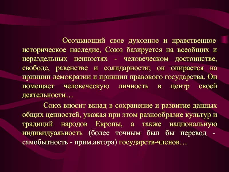 историческое наследие, Союз базируется на всеобщих и нераздельных ценностях - человеческом достоинстве, свободе, равенстве и солидарности; он опирается на принцип демократии и принцип правового государства. Он помещает человеческую личность в центр своей деятельности…