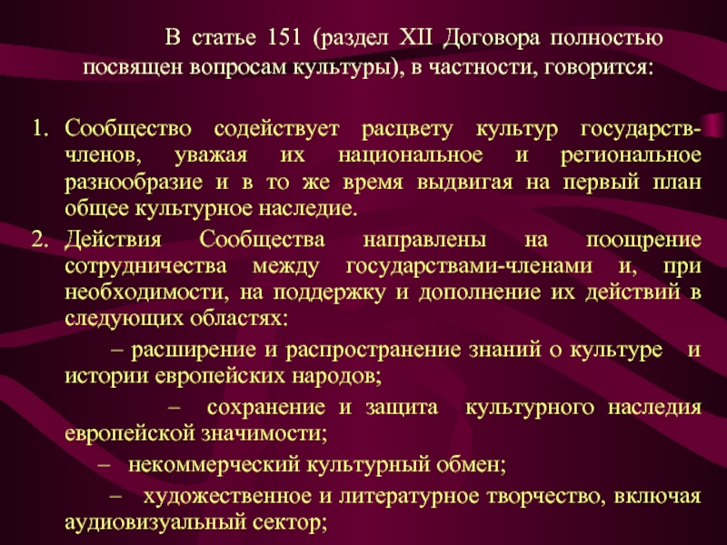 XII Договора полностью посвящен вопросам культуры), в частности, говорится: