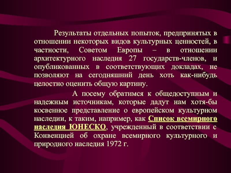 отношении некоторых видов культурных ценностей, в частности, Советом Европы – в отношении архитектурного наследия 27 государств-членов, и опубликованных в соответствующих докладах, не позволяют на сегодняшний день хоть как-нибудь целостно оценить общую картину.