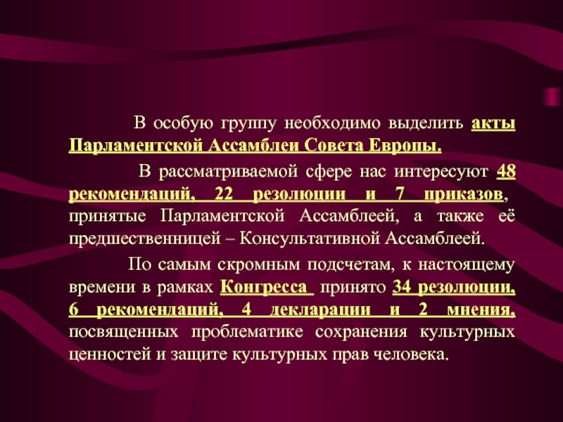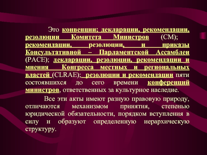 Комитета Министров (CM); рекомендации, резолюции, и приказы Консультативной – Парламентской Ассамблеи (PACE); декларации, резолюции, рекомендации и мнения Конгресса местных и региональных властей (CLRAE); резолюции и рекомендации пяти состоявшихся до сего времени конференций министров, ответственных за культурное наследие.
