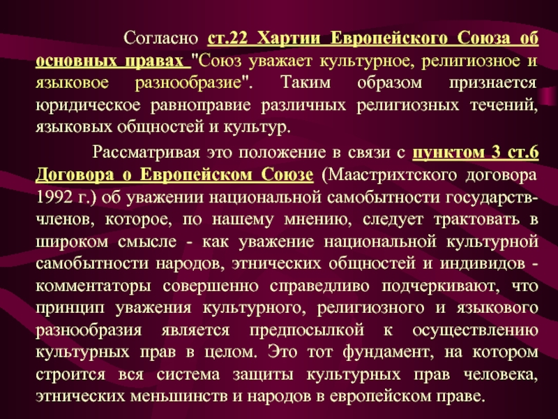 Рассматривая это положение в связи с пунктом 3 ст.6 Договора о Европейском Союзе (Маастрихтского договора 1992 г.) об уважении национальной самобытности государств-членов, которое, по нашему мнению, следует трактовать в широком смысле - как уважение национальной культурной самобытности народов, этнических общностей и индивидов - комментаторы совершенно справедливо подчеркивают, что принцип уважения культурного, религиозного и языкового разнообразия является предпосылкой к осуществлению культурных прав в целом. Это тот фундамент, на котором строится вся система защиты культурных прав человека, этнических меньшинств и народов в европейском праве.